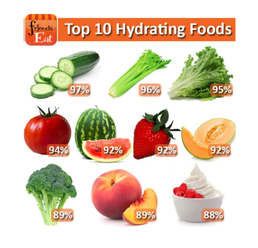 ◦ Water-rich fruits and vegetables such as watermelon, cucumber, grapes, tomatoes, spinach and broccoli.